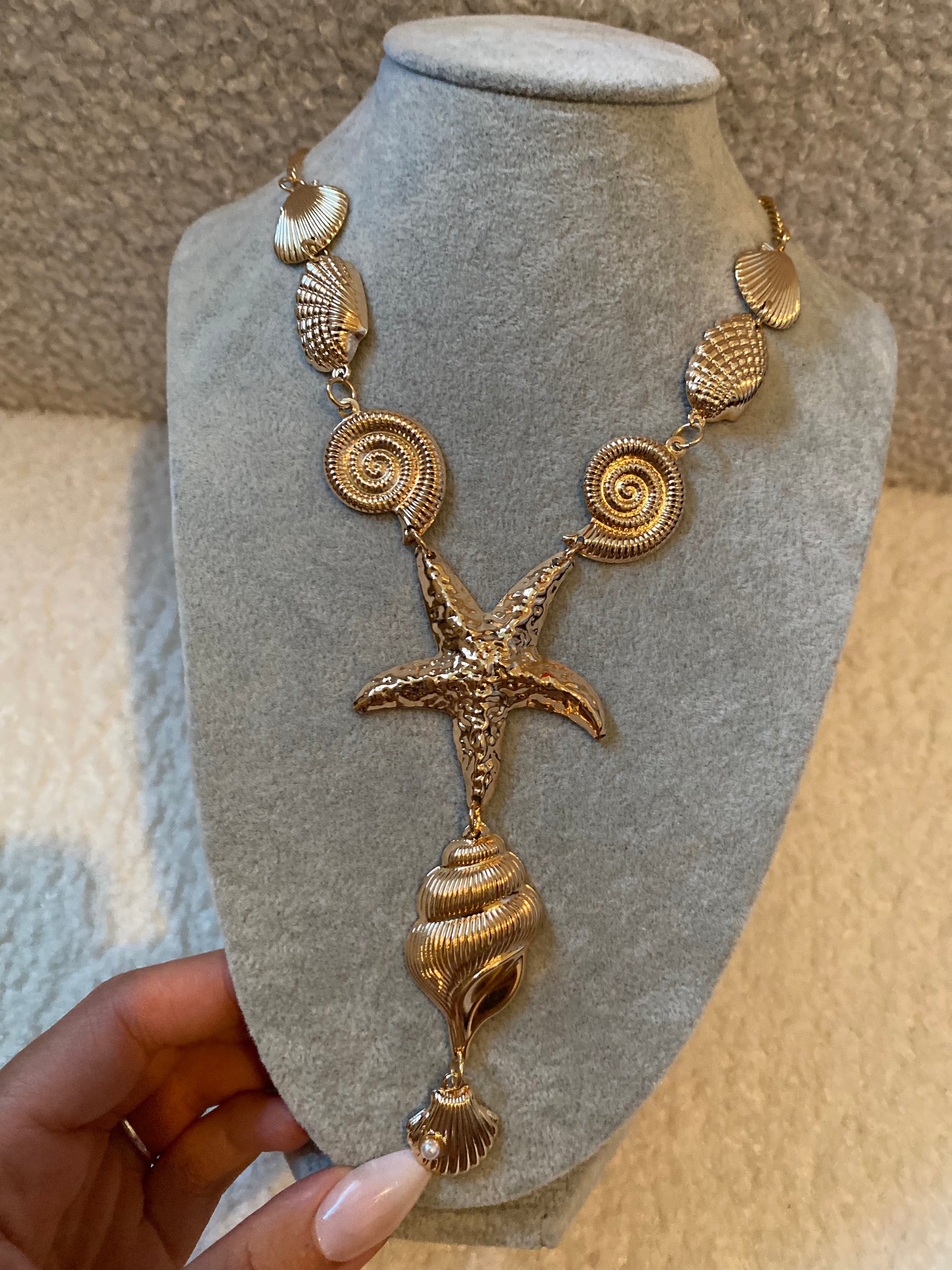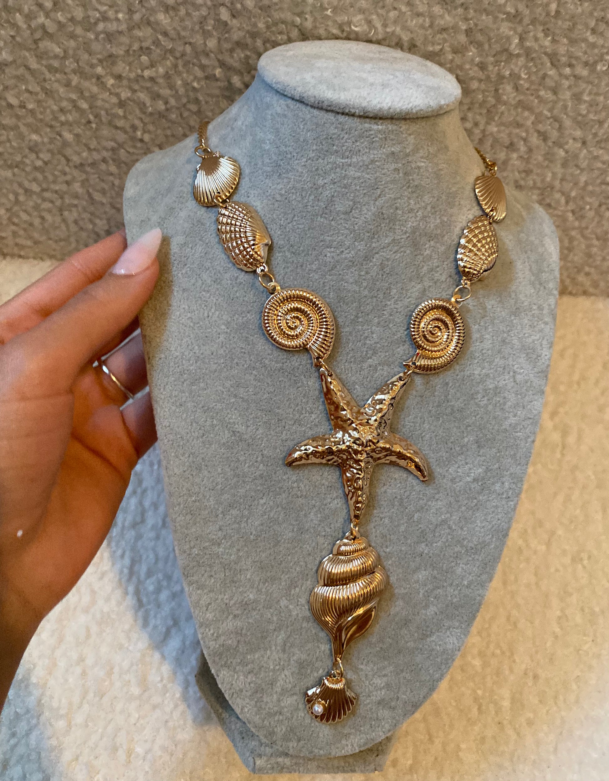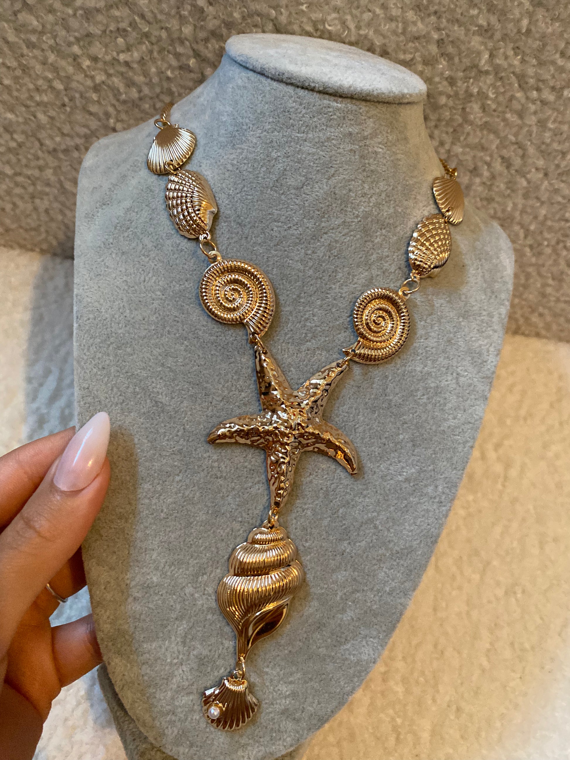 Des coquillages scintillants, une étoile de mer au centre, et une ligne dorée qui glisse jusqu’au creux du décolleté.